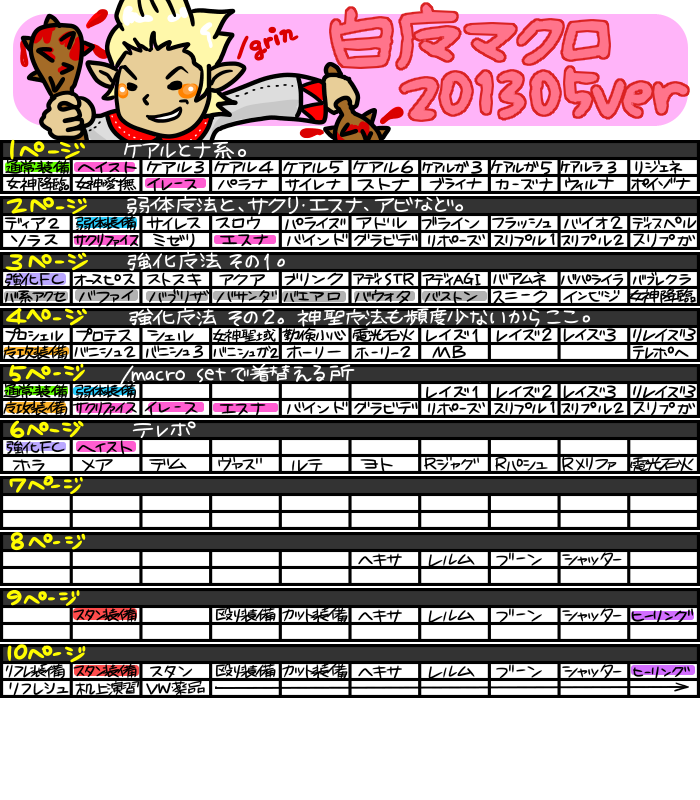 | 3ページ目の強化FCについて。 属性バ系以外は微妙に詠唱が長く感じちゃう!でも詠唱するからにはちゃんとした効果を出したい!! だけど手の込んだマクロはだるい!!という事で強化魔法は下記の装備と順序で。 太字になってるのが着替える部位だよ。 |